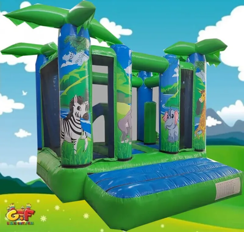 This jungle bouncy castle from GF bouncy castle Bouncy Castle Hire will be an unforgettable treat for your little ones at their next party! The jungle artwork features ,giraffes, lions, tigers, tropical birds and all the other creatures of the jungle, and it will look absolutely fantastic wherever you place it